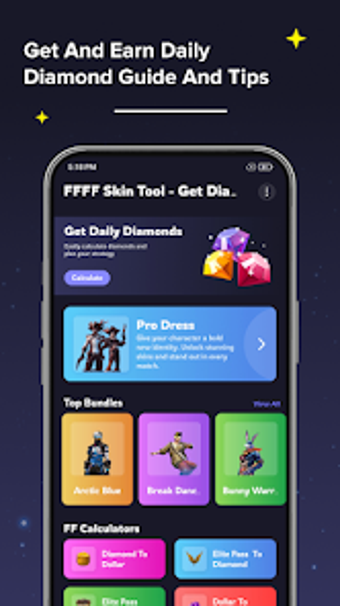 FFFF Skin Tool - Get Daily Diamonds är en gratis app för Android som erbjuder användare en omfattande guide för att tjäna obegränsade diamanter i FFF. Denna app gör det möjligt för spelare att få tillgång till dagliga diamanter, emotes, pass och skins genom en enkel användargränssnitt. Med steg-för-steg-tips kan användarna snabbt lära sig att maximera sina belöningar och fördjupa sin spelupplevelse. FFFFF Skin Tool är utformad för att vara lättanvänd och erbjuder information om pro-dressar, sällsynta emotes, fordon och vapen.